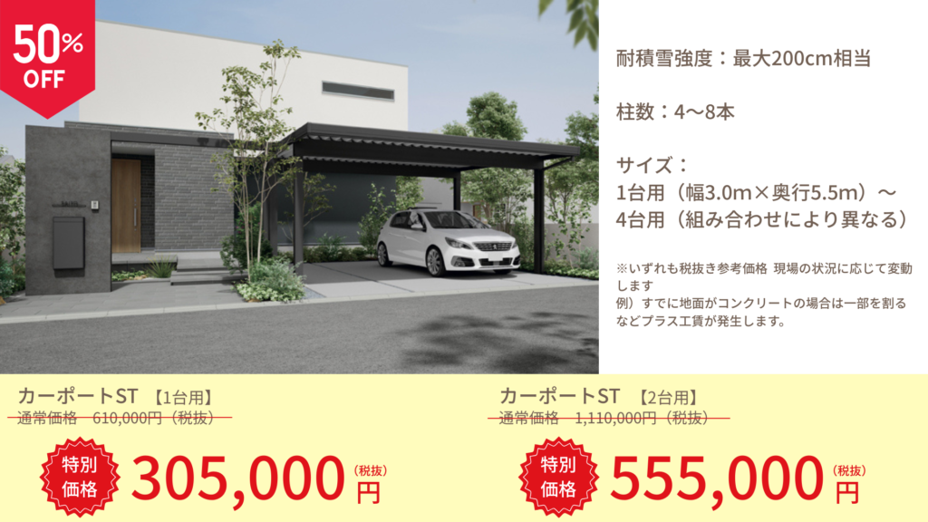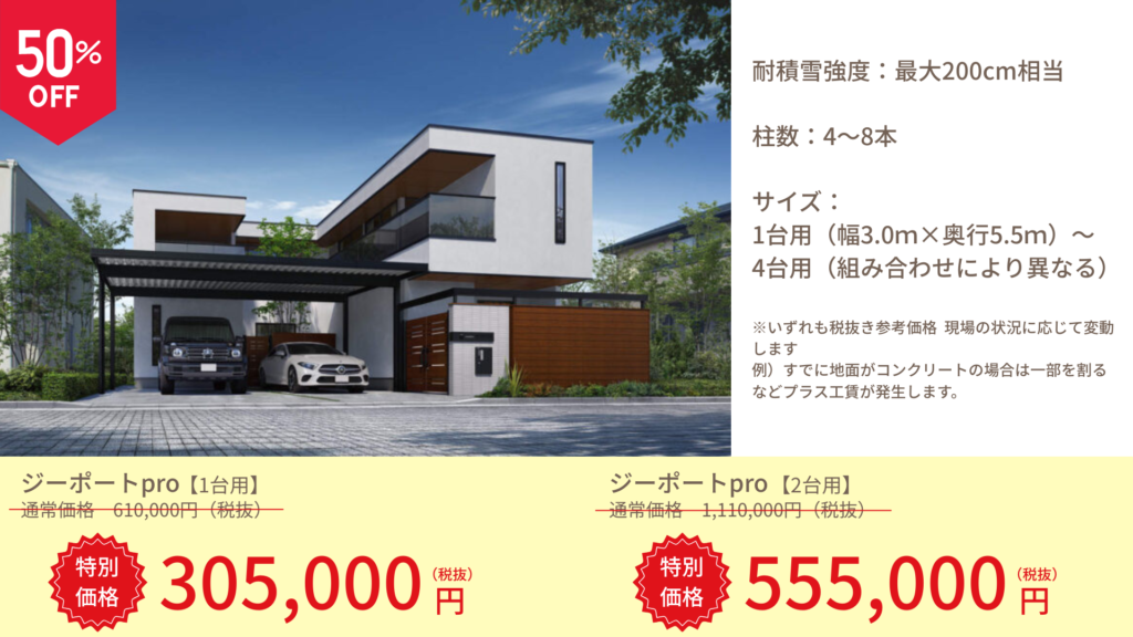 ・耐積雪強度:最大200cm相当・柱数:4本~8本・サイズ:1台用(幅3.0m×奥行5.5m)~4台用(組み合わせにより異なる)・価格:・1台用:61万円→50%OFFで30.5万円(+施工費16万 ※土間コンクリートも施工した場合は+27万程度)