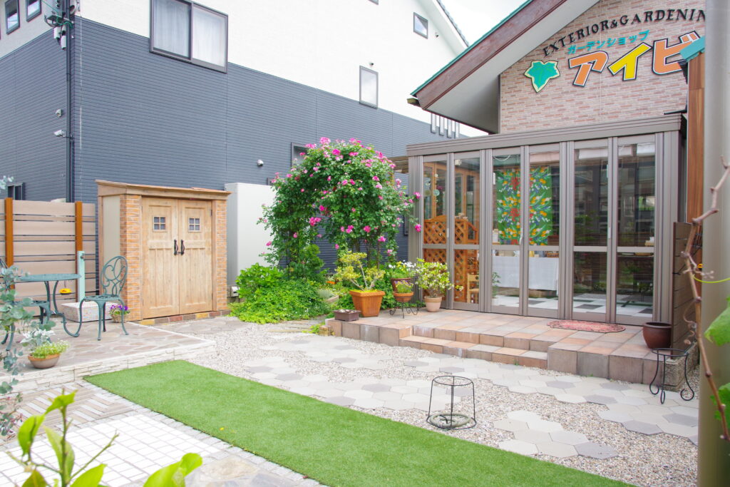 江村工設はいつでもご来店いただける エクステリア展示場・ガーデニンググッズ販売の「アイビー」を併設しています。