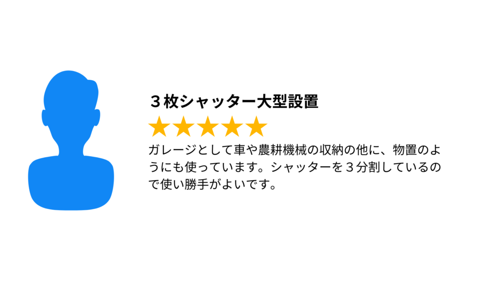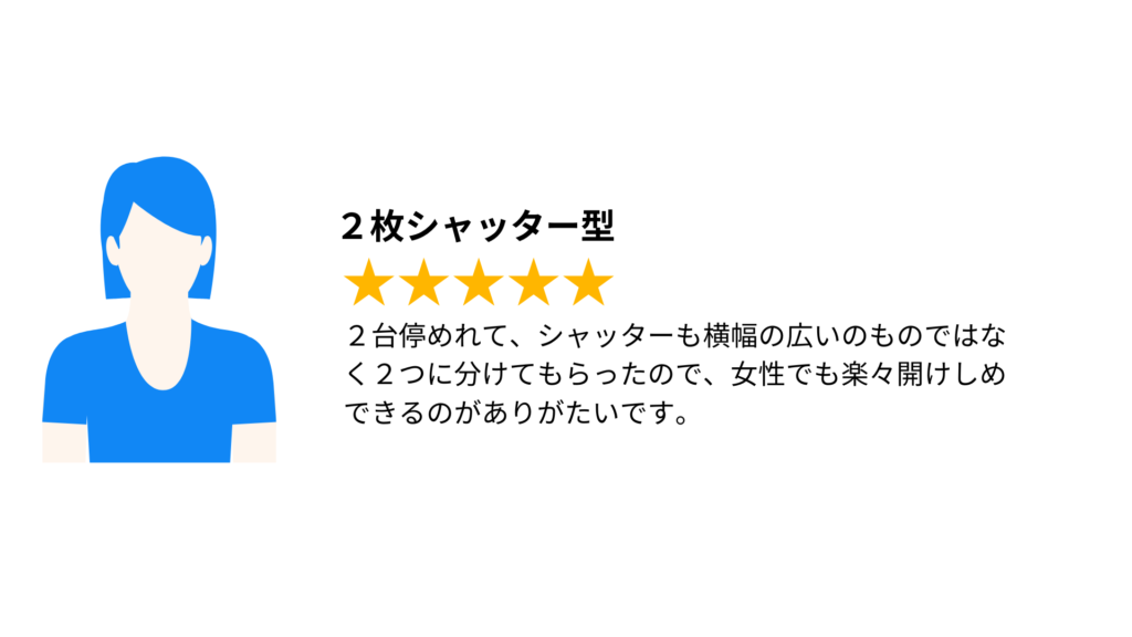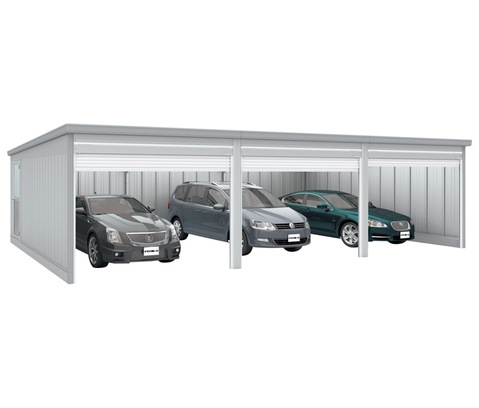 大型車含めて3台のスペースを確保できる広さでもこちらのタイプの屋根素材はしっかりしており、シャッターもあり、お車をしっかり守り、耐久性も期待できます。